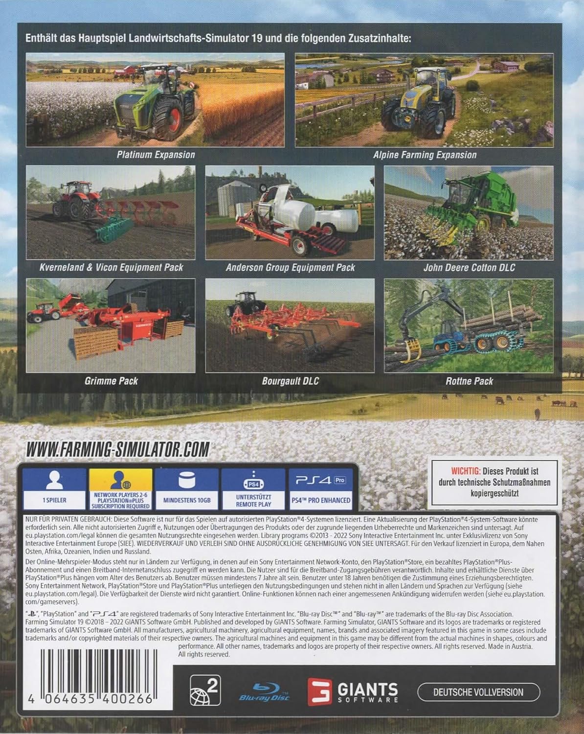 Die Landwirtschafts-Simulator 19: Ambassador Edition für PS4 ist eine umfangreiche Komplettausgabe der beliebten Farming-Simulation. Neben dem Hauptspiel enthält diese Edition alle großen Erweiterungen und mehrere DLC-Pakete – darunter die Platinum- und Alpine-Farming-Erweiterungen sowie verschiedene Maschinen- und Geräte-Packs. Du übernimmst eine Farm, baust Felder an, pflegst Tiere wie Kühe, Schafe und Pferde, fährst realistische Landmaschinen bekannter Marken und gestaltest deine Landwirtschaft ganz nach deinen Vorstellungen. Die abwechslungsreiche Mischung aus Feldarbeit, Tierpflege und Maschinenmanagement macht diese Edition zu einem idealen Einstieg für Fans der Serie oder alle, die ein realistisches Bauernhof-Erlebnis auf der Konsole suchen.